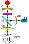 Elemente componente: S -sursa de lumina; C -sistem optic de colimare; F -filtru; Ld -lama divizoare; Exp -sistem optic de expandare; Fd -fotodetector; Ob -obiectiv. Functionare: Fasciculul luminos provenit de la sursa de lumina este colimat cu ajutorul sistemului optic de colimare si traverseaza filtrul, este apoi divizat de lama divizoare. Fasciculul orizontal este expandat de sistemul de expandare si apoi cade incident pe fotodetectorul. Celalalt fascicul traverseaza sistemul optic. Pozitionand fotodetectorul exact in franja paterna a fasciculului se va obtine imaginea transformata de sistemul optic al ochiului. |