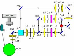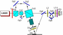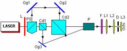 Elemente componente: PL1, PL2 - lame jumatate de unda; Og1,Og2, Og3 - oglinzi; Cd1, Cd2 - cuburi divizoare; L1, L2, L3 - lentile; P - prisma; F – filtru. Functionare: Asemanatoare cu ce prezentata in exemplul anterior. |