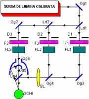 Elemente componente: Og1, ,Og4 -oglinzi plane; Og5 -oglinda sferica; Og6 -oglinda parabolica; Ld1, , Ld3 -lame divizoare; D1, , D3 - diafragme iris; F1, , F3 -filtre de culoare; FL1, , FL3 -filtre Louvre; SL -sistem lenticular. Functionare: Cele trei cai optice, realizate prin devierea fasciculelor cu ajutorul sistemelor de reflexie, converg pe retina ochiului de studiat. Se obtine astfel un semnal ce culege informatii asupra senzatiei de forma a ochiului de studiat. |