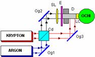 Metoda holografica de studiu a functiei vizuale | Functionare: Cele doua lungimi de unda ale dipozitivelor LASER se combina pe cubul divizor, obtinandu-se astfel o marime intre 4764,8A corespunzator dispozitivului cu argon si 4762,3A, corespunzator celui cu krypton. Fasciculul astfel obtinut este dirijat prin intermediul oglinzilor pe distantierul optic de interferenta. Standul prezentat este utilizat pentru inregistrarea hologramei in volum a fundului de ochi studiat. |