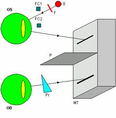 | Functionare: Cei doi stimuli sunt primiti de cele doua linii generate de monitorul televizat. Subiectul trebuie sa incerce sa fuzioneze cele doua imagini primite de la cele doua ecrane intr-o singura impresie vizuala. Parametrii stimulului astfel obtinut pot fi calculati functie de distanta dintre ecran si ochii subiectului, de modul de separatie dintre cele doua linii de pe ecrane, de distanta interpupilara a subiectului si de puterea de dispersie a prismei utilizate. |