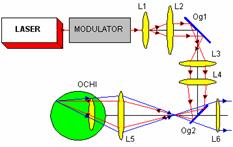 Elemente componente: L1, , L6 - lentile; Og1, Og2 - oglinzi; M -modulator. Functionare: Fasciculul provenit de la dispozitivul LASER este mai intai modulat, apoi parcurge sistemul L1-L2-Og1-L3-L4-Og2-L5 si este proiectat pe fundul de ochi al pacientului. Aici, acest fascicul se reflecta, este proiectat prin lentila L6, iar apoi este fotomultiplicat. Standul prezinta posibilitatea atat a studiului elementelor optice refringente ale ochiului, cat si a corectiei eventualelor vicii de refractie ale ochiului. |