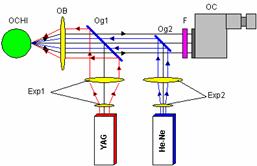 | | Functionare: Radiatia provenita de la dispozitivul YAG este expandata prin sistemul Exp1, sufera o reflexie pe oglinda Og1 si este proiectata pe ochiul pacientului prin obiectivul OB. Optometristul vizeaza ochiul pacientului utilizand ocularul, care primeste informatii de pe fundul de ochi prin intermediul sistemelor OB si F. Dispozitivul He-Ne este utilizat pentru punerea la punct a sistemului. |