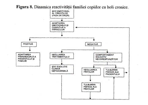 orientare defensiva ci, prin maturitatea psihica si angajarea in rezolvarea practica a problemelor aparute, pot contribui la reusita adaptarii psihosociale a tuturor membrilor familiei. Esecul parintilor de a-si gasi propriul echilibru interior, poate constitui premisa pentru aparitia unor tulburari psihice la copilul bolnav si fratii acestuia. Neglijarea aspectelor legate de tratamentul bolii poate avea repercusiuni negative atat asupra adaptarii copilului, cat si a parintilor, datorita evolutiei