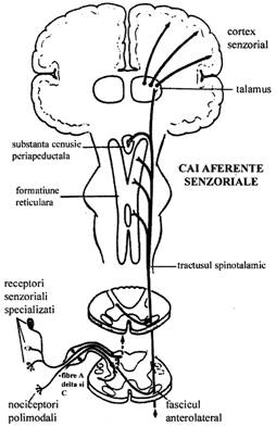 Cea mai importanta cale ascendenta pentru transmisia informatiei nociceptive aferente este reprezentata de tractul spinotalamic situat anterolateral in substanta alba medulara. Este format din doua portiuni: