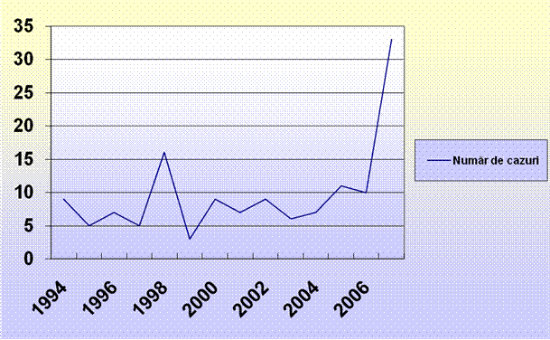 Fig.I.2. Numarul de probe biologice pozitive pentru toxina botulinica identificate de catre laboratorul de anaerobi al I.N.C.D.M.I Cantacuzino in perioada 1994-2007.