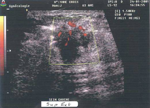 De mai mult de 10 ani, numerosi autori au tentat definirea criteriilor unui flux arterial tumoral pe baza unei analize prin efect Doppler continuu si ecografie duplex. Mai recent, dupa 1987, aparatele de codaj color al fluxului sanguin, au permis studiul, de o maniera mai precisa, al vascularizatiei din leziunile sanului. Cele mai multe studii din zilele noastre au incercat sa stabileasca o relatie intre aspectul caracteristic al fluxului sanguin tumoral si o leziune suspecta clinic sau mamografic. Tipic, un ' flux tumoral ' are o componenta sistolica ridicata si un flux diastolic net marcat corespunzand unei artere cu rezistenta scazuta.