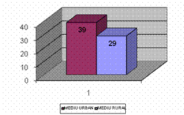 Din analiza graficului nr.1 se observa ca pacientii de sex feminin sunt īn procent de 57 % (39 de pacienti) comparativ cu cei de sex masculin (43 % sau 29 de pacienti). De asemenea, din acelasi grafic, mai rezulta ca din mediul urban provin 39 de pacienti iar din mediul rural 29 de pacienti. Dintre cei 68 de pacienti luati īn studiu, 36 au fost internati pe Clinica de Cardiologie iar restul de 32 au fost lasati la domiciliu.