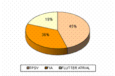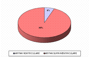 Graficul de mai sus ilustreaza distributia tahidisritmiilor cardiace dupa sediul de producere. Se observa ca majoritatea acestor disritmii (95 %) sunt de tip supraventricular si numai 5 % sunt de tip ventricular. Dintre disritmiile supraventriculare, majoritare sunt tahicardiile paroxistice supraventriculare (TPSV) - īn procent de 46 %, urmate de fibrilatia atriala (FiA) - īn procent de 35 % si flutterul atrial (FlA) - 19 %. Dintre pacientii cu TPSV mentionam 2 pacienti care au prezentat si sindrom Wolff-Parkinson-White (S.WPW). Este vorba de un pacient de 20 de ani si de o pacienta de 25 de ani, care prezinta TPSV si S.WPW si sarcina 26 saptamīni īn evolutie. De altfel, pacienta gravida a suferit 6 episoade de TPSV pe perioada luata īn studiu. Aproape toate cazurile de FiA au fost diagnosticate ca FiA paroxistica cu AV īnalta, iar īntr-un caz, FiA era asociata unei boli de nodul sinusal (BNS). Pacientii cu FlA au fost īn majoritate cu transmitere 2:1, un caz a fost cu transmitere 1:1, iar īn celelalte cazuri a fost cu transmitere variabila. Cazurile de aritmii ventriculare la cei 4 bolnavi au fost de diagnosticate astfel: un caz de tahicardie ventriculara (TV), un caz de torsada vīrfurilor (TP), unul de fibrilatie ventriculara (FiV) si altul de tahicardie ventriculara neregulata cu complexe largi. Cazul de FiV a aparut la un pacient de 60 de ani cu IMA inferior.