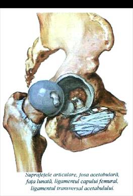 I.1. Acetabulul are forma unei hemisfere cu diametrul 60 de mm si cuprinde 2/3 ale capului femural si este orientat lateral, inferior si anterior. Prezinta un compartiment medial neraticular numit fosa acetabulara, constituit din lama patrulatera acoperita de periost. Compartimentul lateral este articular fiind reprezentat de fata lunata cu forma unei potcoave.