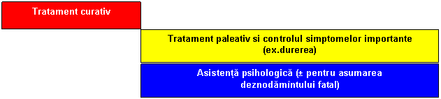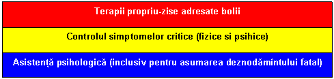 si realist) la terapia de fond. Daca scopul este prelungirea vietii, accentul va cadea pe terapiile ce urmaresc cresterea īncrederii īn sine si autonomiei. Daca gravitatea bolii ofera doar un obiectiv mai putin ambitios (o moarte decenta) accentul va cadea pe o terapie suportiva si oferirea unui minim de confort, inclusiv spiritual, īn fata inevitabilului.