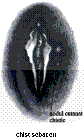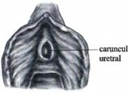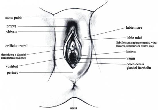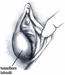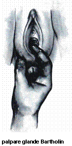 - inspectia organelor genitale externe (mons pubis, perineu, labii mari; apoi, labii mici, clitoris, orificiu uretral, introit vaginal); se urmaresc inflamatii, ulceratii, scurgeri, tumefactii, noduli.