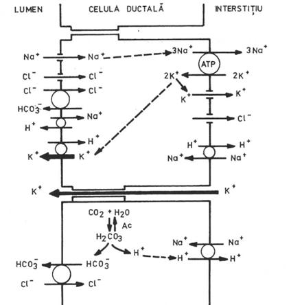 Transportul ductal al apei si electrolitilor: ionii de Na+ sunt reabsorbiti activ din saliva ductala iar K+ este secretat activ. Concentratia sodiului in saliva depinde de fluxul salivar, crescand o data cu cresterea fluxului salivar. Membrana luminala a ductelor are o conductanta mare pentru Na+. Sodiul poate intra din lumen in celula ductala prin: antiportul Na+-H+, canale de Na+. Na+ intrat in celula iese in interstitiu prin pompa Na+-K+ existenta pe membrana bazo-laterala, care asigura astfel scaderea concentratiei Na+ in celula si cresterea concentratiei K+ intracelular. Acesta iese in lumen prin antiport K+-H+ de pe membrana luminala. (Fig.3)