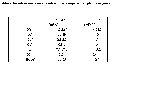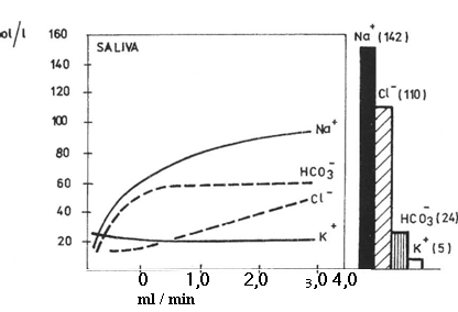 Natriul, clorul sunt in concentratie mai mica in saliva decat in plasma. Clorul asigura activarea amilazei salivare. Potasiul este mai mare decat in plasma, bicarbonatul creste in saliva in urma stimularii, ajungand la 60 mEq/1 si particila la sistemul tampon salivar HCO3/H2CO3. (Fig.4)
