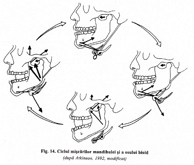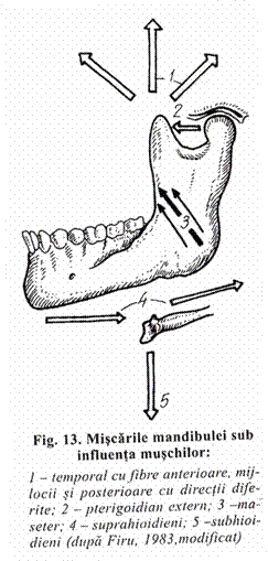 - coborarea mandibulei cu deschiderea voluntara a gurii, proces realizat de contractia controlata de catre sistemul nervos central a m. suprahioidieni, m.subhioidieni si pterigoidieni externi (fascicol inferior) (fig. 13). Coborarea mandibulei este favorizata la om de forta gravitationala. In miscarea de coborare a mandibulei, condilul mandibular face o miscare de translatie inainte si in jos (tractionat de m. pterigoidian extern) odata cu meniscul interarticular.