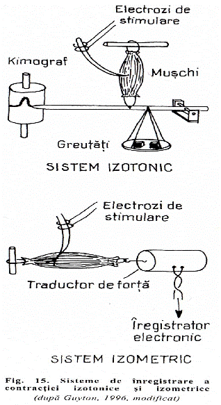 Contractia izometrica se caracterizeaza prin mentinerea constanta a lungimii muschiului si cresterea tensiunii dezvoltata in muschi (fig. 15).