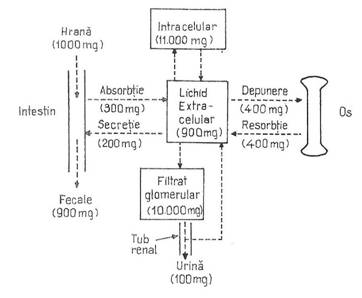 In organism exista un control neuro-umoral complex care se refera la aportul, stocarea si eliminarile de calciu si fosfor (fig. 9). Intre aceste trei aspecte exista un echilibru ce asigura homeostazia fosfo-calcica. Prin dieta se aduc zilnic 1000 mg Ca+2 din care in tubul digestiv se absorb aproximativ 350 mg. La nivel intestinal se produce o secretie de 150 mg calciu si astfel prin fecale se elimina zilnic 650-800 mg calciu. Calciul absorbit la nivel intestinal este trecut in plasma si participa la procesele de remodelare osoasa, zilnic fixandu-se in os aproximativ 500 mg calciu, aceeasi cantitate fiind si mobilizata zilnic din os. Prin urina se elimina zilnic aproximativ 200 mg calciu.