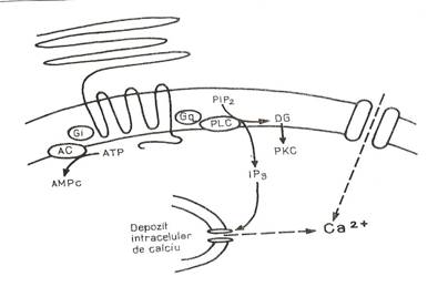 Gi = Proteina G inhibitoare; AC = Adenilat ciclaza; ATP = Acid adenozintrifosforic; AMc = Acid adenozinmonofosforic ciclic; PLC = Fosfolipaza C; PIP2 = Fosfatidilinozitol 4,5 bifosfat: DG = Diacilglicerol; IP3 =inozito1,4,5 trifosfat: PKC = Proteinkinaza C.