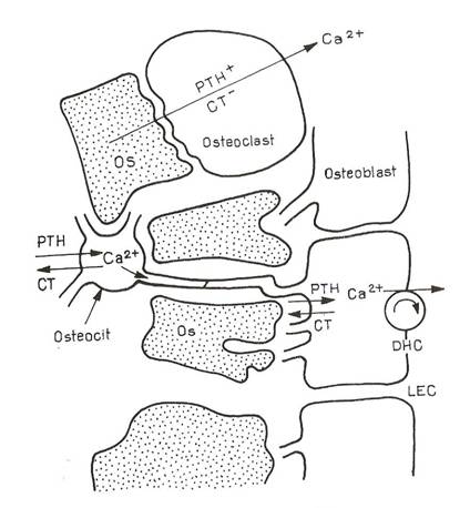 – la nivel osos stimuleaza cresterea numarului si functiei osteoclastelor, mobilizeaza calciu si fosforul din os, favorizeaza transportul activ al calciului din osteocite in lichidul extracelular.