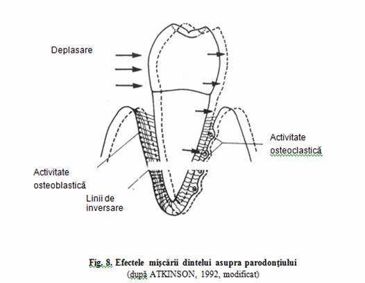 Cand presiunile exercitate asupra dintelui determina miscarea lui, osul este resorbit de pe suprafata unde se exercita presiunea si este depus pe suprafata unde se exercita tensiunea. Deci, se activeaza osteoclastele la locul presiunii si osteoblastele la locul tensiunii (fig. 8).