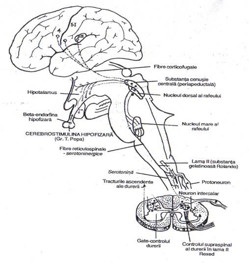 Pāna la realizarea perceptiei dureroase intervin mecanisme mediatoare si modulatoare, care īn diferite etape extra- si intranevraxiale exercita actiuni asupra excitatiei dureroase "princeps". Acest control minutios se exercita inca de la nivel medular, iar apoi, de catre centrii superiori, care īndeplinesc rolul unor veritabile suite de "porti" modulatoare ale intensitatii mesajului dolorigen.