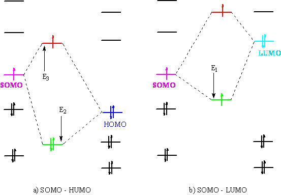 Orbitalul ocupat de catre electronul radicalului liber este SOMO ("Lowest Unoccupied Molecular Orbital"). Acest orbital interactioneaza cu un partener de reactie neradicalic HOMO ("Highest Occupied Molecular Orbital") si LUMO ("Lowest Unoccupied Molecular Orbital") Fig. 1.