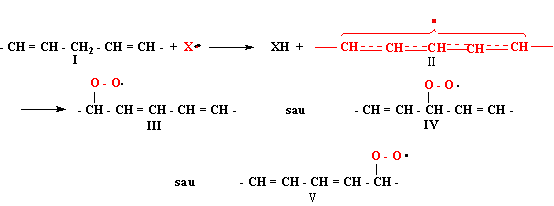 Conform mecanismului general al reactiilor înlantuite, un radical initial provoaca extragerea unui atom de hidrogen din pozitia alilica a unui acid gras nesaturat, deosebit de reactiva si da un radical liber conjugat II, de acelasi tip cu radicalul alil. Aceasta se poate lega cu molecula de oxigen în pozitiile 1, 3 sau 5, caci radicalii hidroperoxidici III si V contin legaturi duble conjugate, spre deosebire de IV ce prezinta legaturi duble izolate. Sistemele conjugate sunt mai stabile [9].