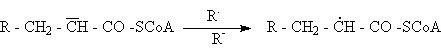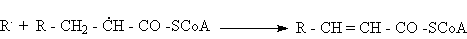 Un alt exemplu de reactie radicalica este introducerea în molecula a unei noi legaturi duble. Radicalii liberi manifesta o reactivitate ridicata si participa la extragerea atomilor de hidrogen, aditie radicalica, scindarea legaturilor covalente si la reactii de anihilare. La modul general în prezenta unui agent nucleofil puternic acil-CoA se poate transforma într-un carboanion care în prezenta unui radical liber trece într-un acid nesaturat dupa urmatoarea schema: