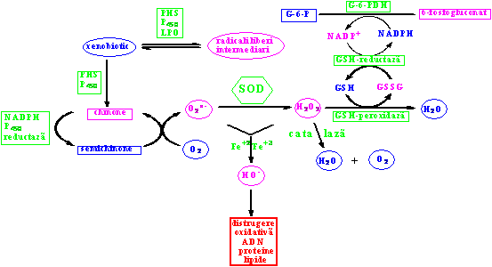 Radicalii liberi ai oxigenului sunt specii moleculare din sistemele aerobe. Mitocondria este locul în care se desfasoara reducerea oxigenului la apa prin intermediul citocrom oxidazei. De fapt citocromul P450 reduce oxigenul la metaboliti activi, care apoi oxideaza o varietate larga de substraturi. Produsii de reactie includ radicali liberi intermediari, care ori sunt redusi mai departe, ori sunt eliberati din situsul activ al enzimei si reactioneaza cu gruparile nucleofile din imediata vecinatate [9]. Mecanismul de formare a radicalilor liberi este ilustrata în schema din figura 2.