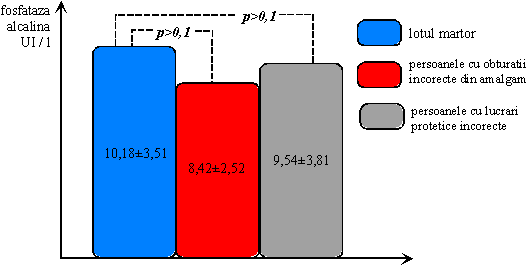Valorile fosfatazei alcaline la persoanele cu obturatii incorecte din amalgam au fost scazute însa nesemnificativ din punct de vedere statistic (de la 10,18 3,51 UI/l la lotul martor la 8,42 2,52 UI/l) (p>0,1) Fig. 1.