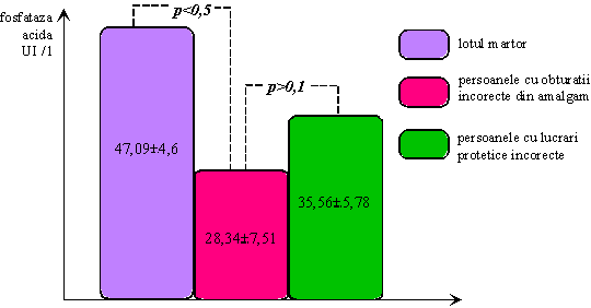 Persoanele cu obturatii incorecte din amalgam au avut o activitate enzimatica mai scazuta a fosfatazei acide comparativ cu grupul martor (de la 47,09 4,6 UI/l la grupul martor la 28,34 7,51 UI/l) Fig. 2.
