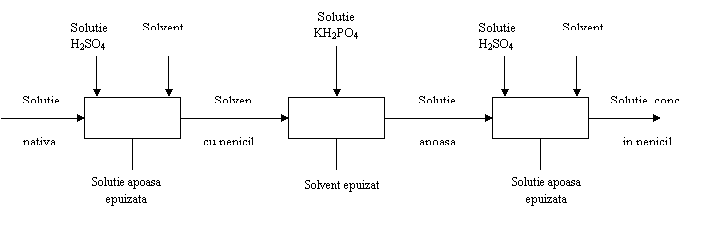 Datorita diluatiei mari, separarea penicilinelor se poate realiza rentabil numai prin extractii repetate cu solventi, conform schemei :