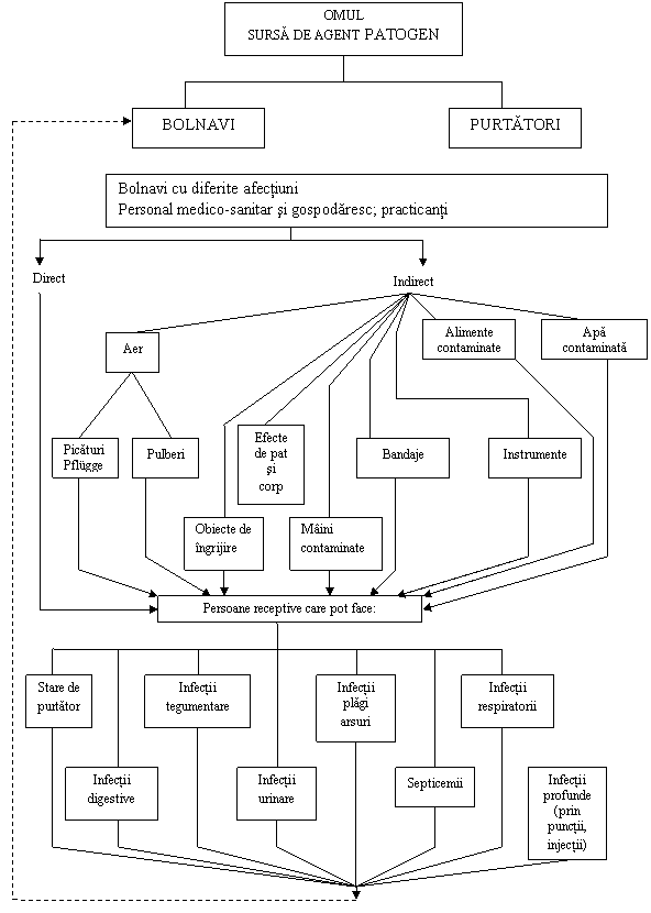 Fig.1 Schema modurilor si cailor principale de transmitere în infectiile nosocomiale