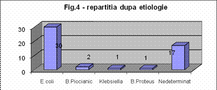 S-a observat ca în cele mai multe cazuri - 30 (58 %), infectiile urinare s-au datorat agentului etiologic E. coli, urmat de bacilul piocianic - 2 cazuri (3,9%), Klebsiella 1 caz (1,9%), Proteus - 1 caz (1,9%), restul fiind nedeterminat - 17 cazuri (33,3%).