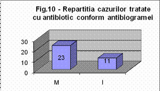 Tratamentul antibiotic s-a facut conform antibiogramei la 34 cazuri, din care pentru 23 cazuri (67,6%) cu antibioticul la care este cel mai sensibil germenul incriminat, la 11 (21,5%) pacienti eficienta lui a fost cotata ca intermediara.