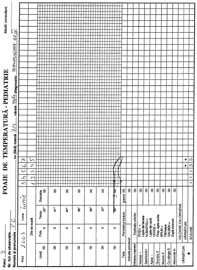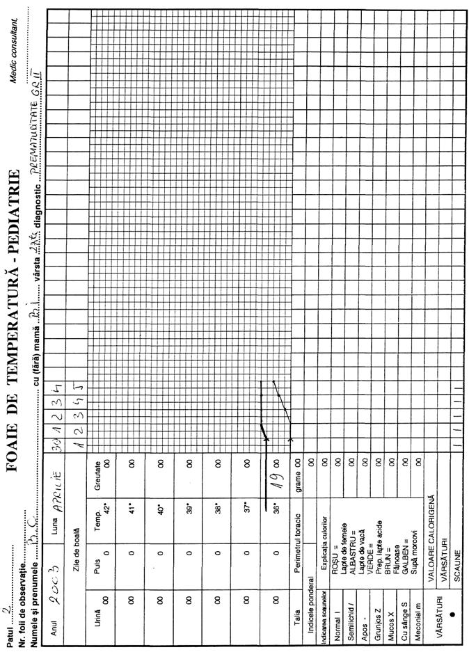 Alimentatia a fost sistata din cauza hemoragiei digestive, copilul neputand fi reechilibrat hidroelectrolitic-hematologic. Data fiind greutatea mica la nastere si problemele aparute ulterior copilul a decedat.