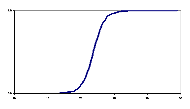 este suficient de buna pentru "prognozarea" probabilitatii de vindecare în functie de concentratia dozei injectate. Redenumiti nume_LOGISTIC.xls fisierul An2_11_1.xls. Pe singura sa foaie de calcul plasati în celula D1 textul "Prob", în celula D2 formula -26.2133+1.1993*A2 iar în celula E2 formula =D2/(1+D2) Extindeti aceste formule pe coloane, apoi folositi datele din coloanele A si E pentru a crea o diagrama de tipul X-Y. Ar trebui sa obtineti o logistica. |