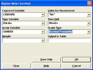 Salvati forma noua (cu 200 de înregistrari) cu numele nume_DIALIZA.xls. Preluati apoi acest fisier cu EpiInfo, modulul Analysis. Nu exista pacienti "pierduti din vedere". Adaugati înca o coloana, sa o numim Durata, în care sa plasam durata de supravietuire pentru pacienti (exprimata în saptamâni). Pentru cei necenzurati va trebui sa evaluam numarul de zile între data începerii tratamentului si data decesului, iar pentru cei cenzurati numarul de zile între data începerii tratamentului si data curenta (pe care o putem prelua din parametrul SYSTEMDATE al sistemului de operare). Adaugarea noii coloane se va face cu comanda Define din grupul Variables. Dupa care se va folosi comanda Assign pentru a completa valorile. Pentru început asignati variabilei Durata expresia =DAYS(DATEINIT,SYSTEMDATE)/7 care va avea efect asupra tuturor înregistrarilor, cenzurate sau nu. Observati comanda înregistrata în fereastra Program Editor (dreapta-jos). Continuati în aceasta fereastra, inserând prin tastare urmatorul program scurt: IF CENSURE="No" THEN =DAYS(DATEINIT,DATEDEATH)/7 END dupa care Run This Command Dispunem acum de duratele (în saptamâni) necesare pentru utilizarea comenzii Kaplan-Meier Survival din grupul Advanced Statistics Evident, dupa declansarea ei va trebui sa alegem variabilele si valorile dorite, în caseta de dialog a comenzii, ca în figura urmatoare. Observati ca drept variabila de grupare am ales Gender, iar unitatea de timp este, evident, saptamâna. |