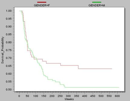Diagrama probabilitatilor de supravietuire ar trebui sa fie asemanatoare celei din figura de mai jos. Se poate observa ca exista o diferenta "sensibila" între cele doua curbe, cu impresia ca grupa "femeilor" beneficiaza de o supravietuire mai buna, pe termen lung, decât grupa "barbatilor". |