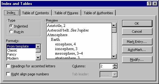 Apoi, pentru crearea Cuprinsului se va apasa tasta OK din fereastra Index and Tables.