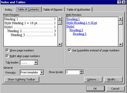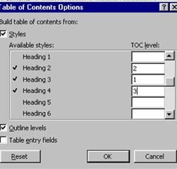 Se poate alege numarul de nivele afisate, aparitia numarului de pagina etc. Iar folosind optiunea Options se poate fixa īn dreptul fiecarui stil nivelul titlului :