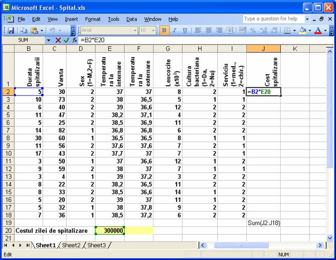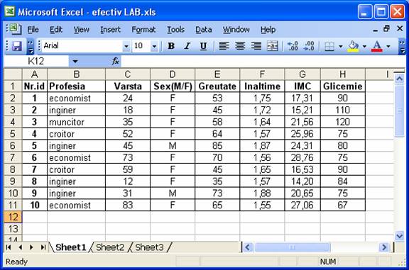 Deschideti aplicatia Microsoft Excel (butonul Start-Programs-Microsoft Excel) si realizati un tabel cu aspectul de mai jos, īn care introduceti date pentru 10 pacienti: