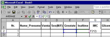 Pentru a introduce o formula īntr-o celula īncepeti īntotdeauna cu = si adresati celulele prin numele celulei (litera care desemneaza coloana si cifra care indica linia); īn cazul nostru formula este Greutate(kg)/Inaltime(m)2, ceea ce se traduce pentru celula G2 īn formula: = E2/(F2^2). Cānd introduceti formula sau daca doriti modificarea ei, puteti face acest lucru scriind īn zona rezervata special, bara de formule: