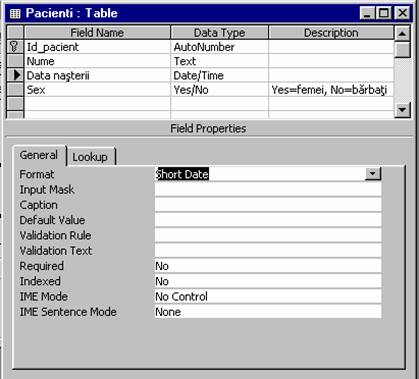 Realizati 2 tabele, Pacienti si Consultatii (corespunzatoare entitatilor de mai sus), folosind optiunea Create table in Design View, cu urmatoarea structura :