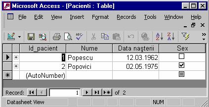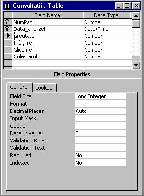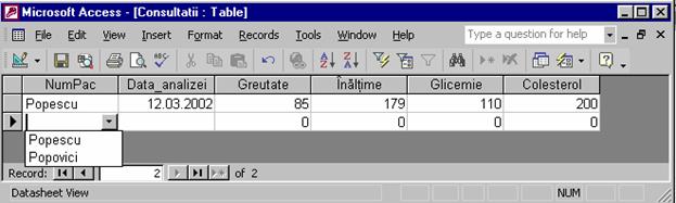 Īn tabela Consultatii, īn mod de editare structura (fereastra deschisa prin actionarea butonului Design din baza de date Cabinet), se alege linia continānd NumPac si se modifica tipul cāmpului din "Number" īn "Lookup Wizard". Legatura se face la tabelul Pacienti, cu afisarea cāmpului "Nume". Astfel continutul tabelelor va fi de forma :