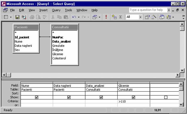 Salvati interogarea sub numele de Query1. Dupa realizare, deschideti Query-ul cu butonul Open si verificati corectitudinea datelor afisate ( ele trebuie sa īndeplineasca conditia data).