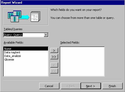 Alegeti toate cāmpurile din Query1 pentru a fi introduse īn raport