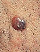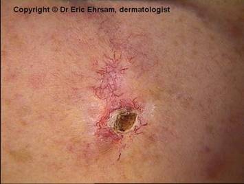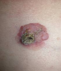 Examenul dermatologic obiectiv: ulceratie de dimensiuni de 2/2 cm cu zone de hemoragie si cruste.