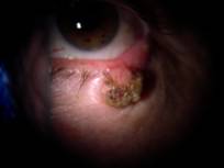 Examenul clinic dermatologic: la baza piramidei nazale, in unghiul intern al ochiului, se observa o leziune tumorala, cu dimensiuni de 2/2 cm, cu marginile perlate, iar central cu ulceratia tegumentului acoperita de crusta, zone de hemoragie.