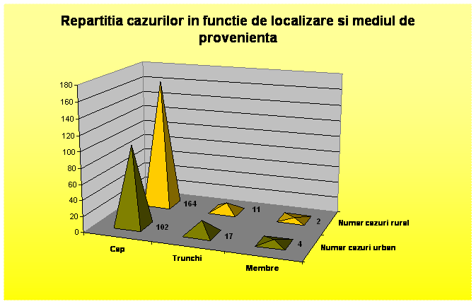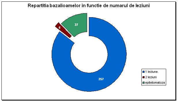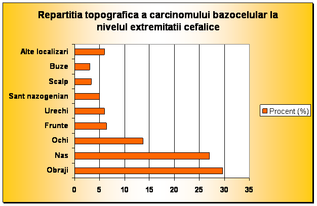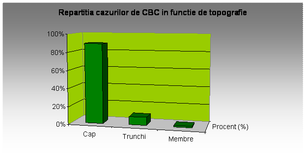 . Pentru a stabili regiunile cele mai expuse la dezvoltarea unor epitelioame bazocelulare, am facut o repartitie topografica regionala a localizarii acestora pe esantionul ales aleator. In 89 % din cazuri, localizarea a fost la nivelul capului, cu frecventa maxima la nivelul obrajilor, nasului, ochilor si fruntii. Zone de electivitate sunt santul nasogenian, unghiul intern al ochiului si marginea libera a pleoapei inferioare.